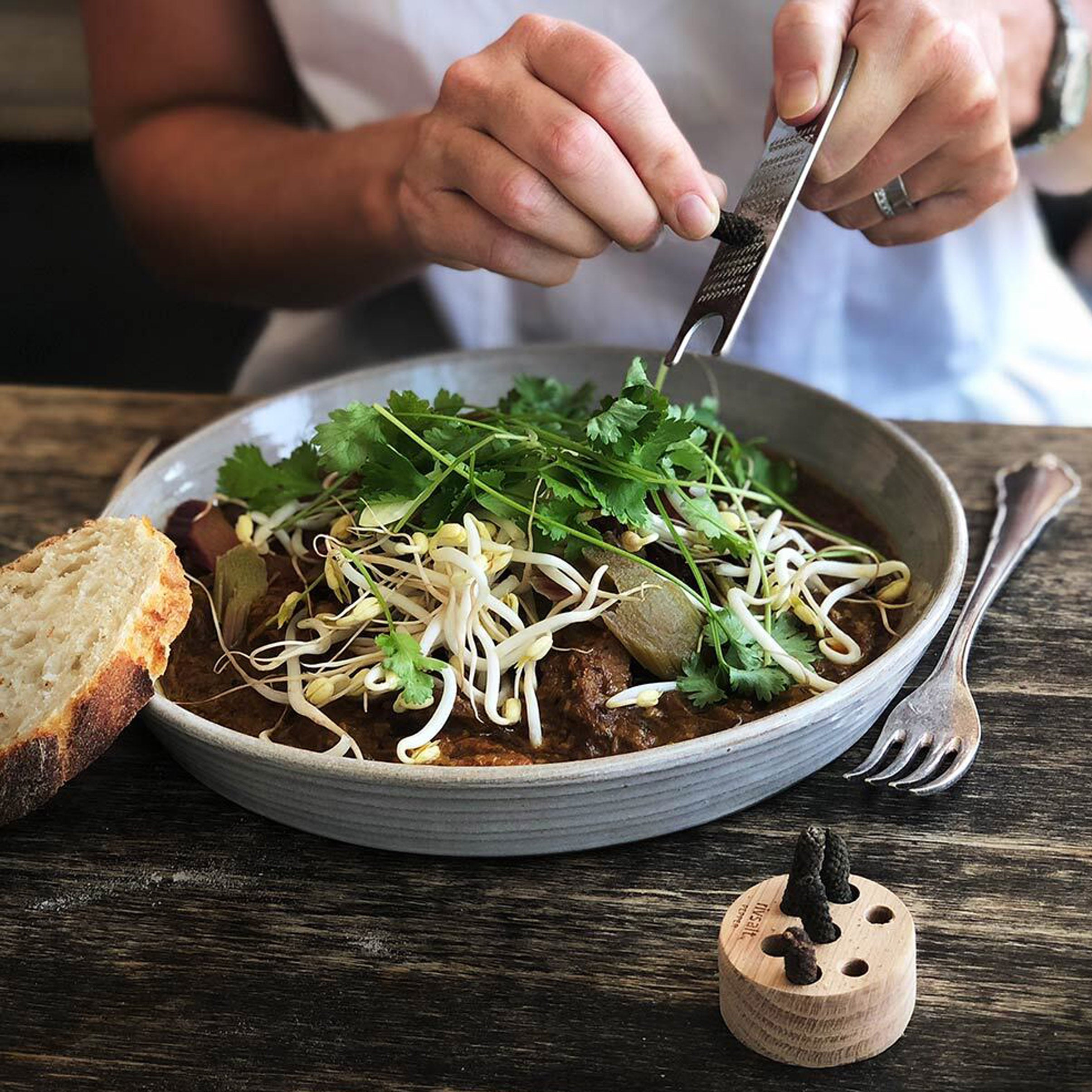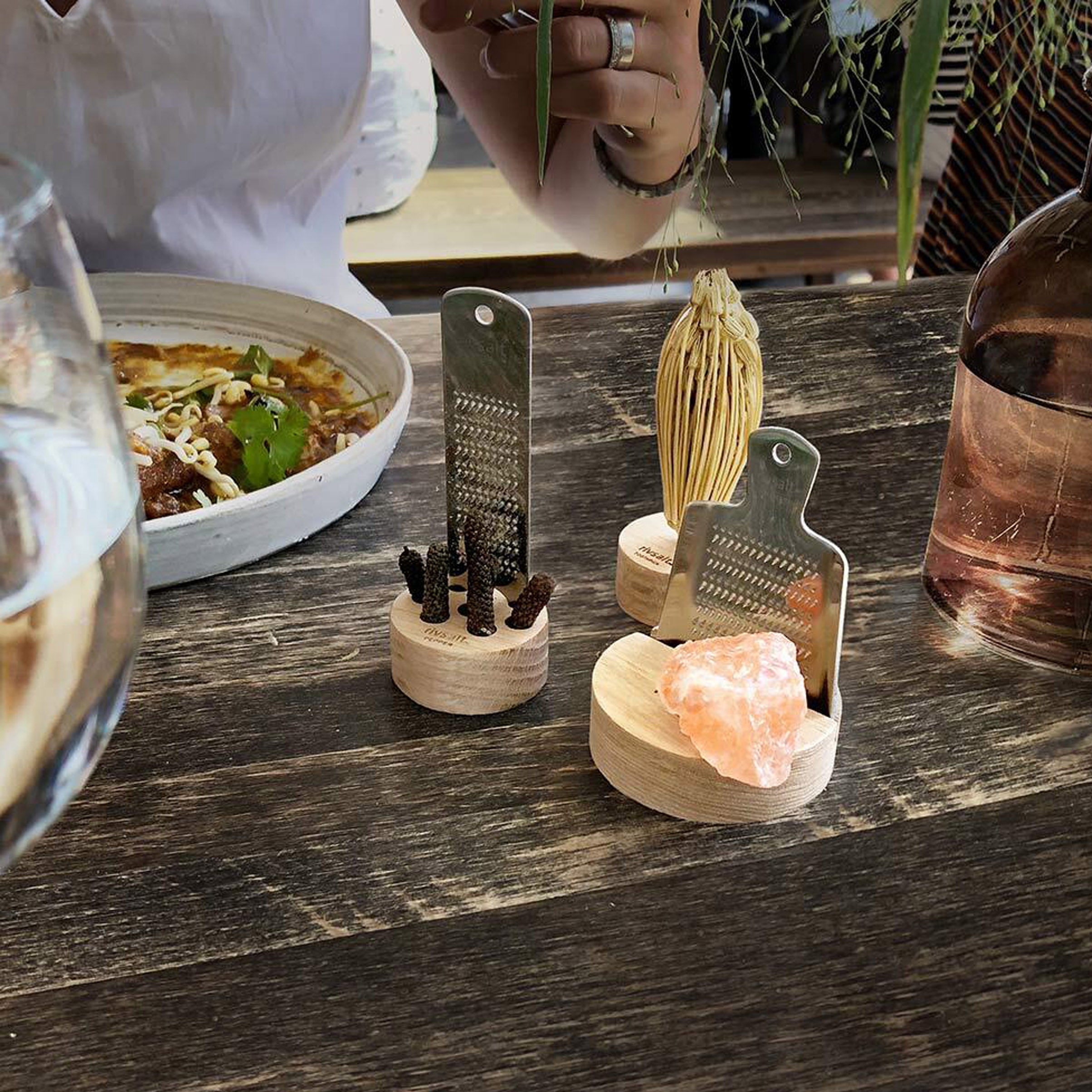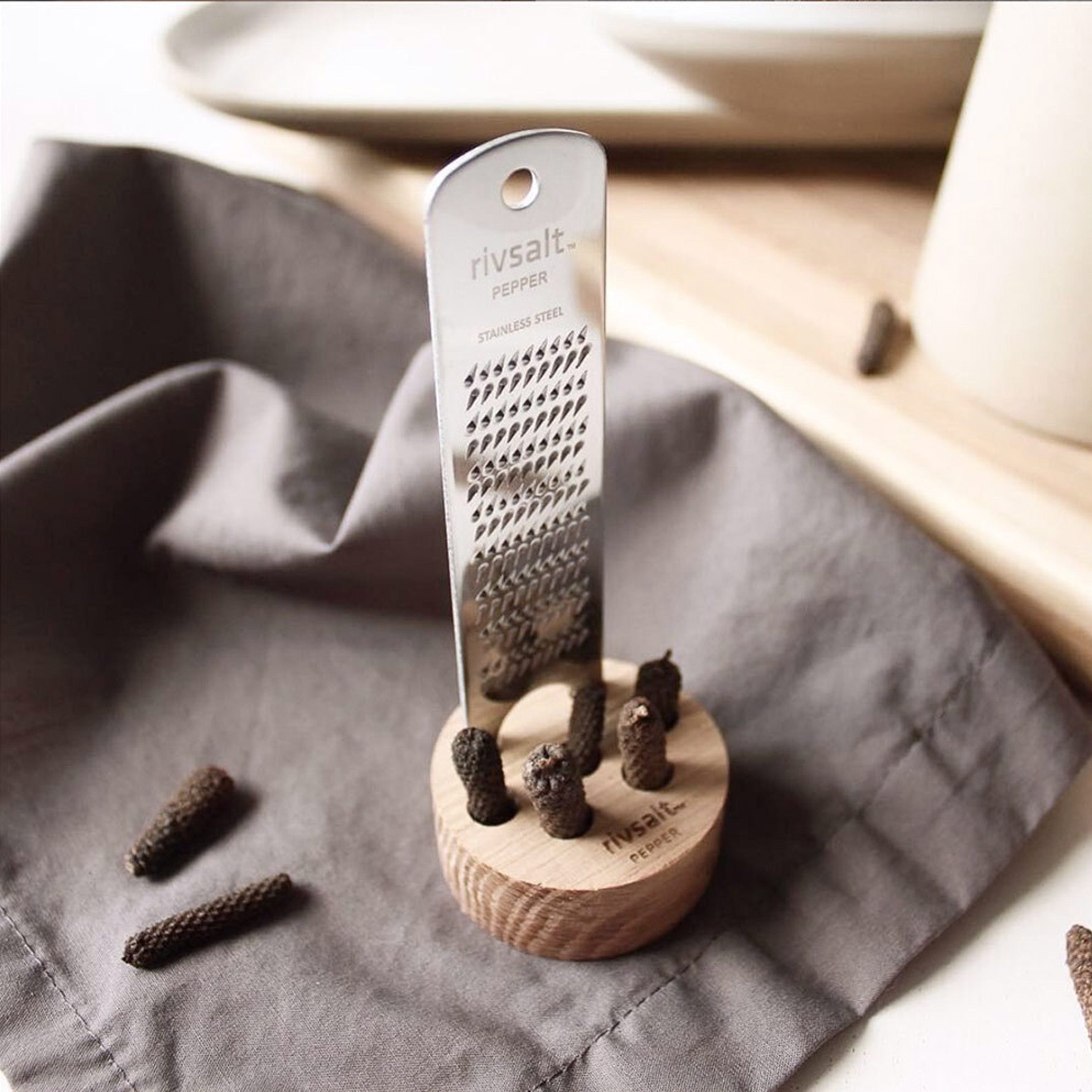 Rivsalt pepper creates a fun culinary experience to the seasoning of dishes. Each set contains several aromatic long peppercorns from the Indonesian island of Java, a stainless steel grater with stand.