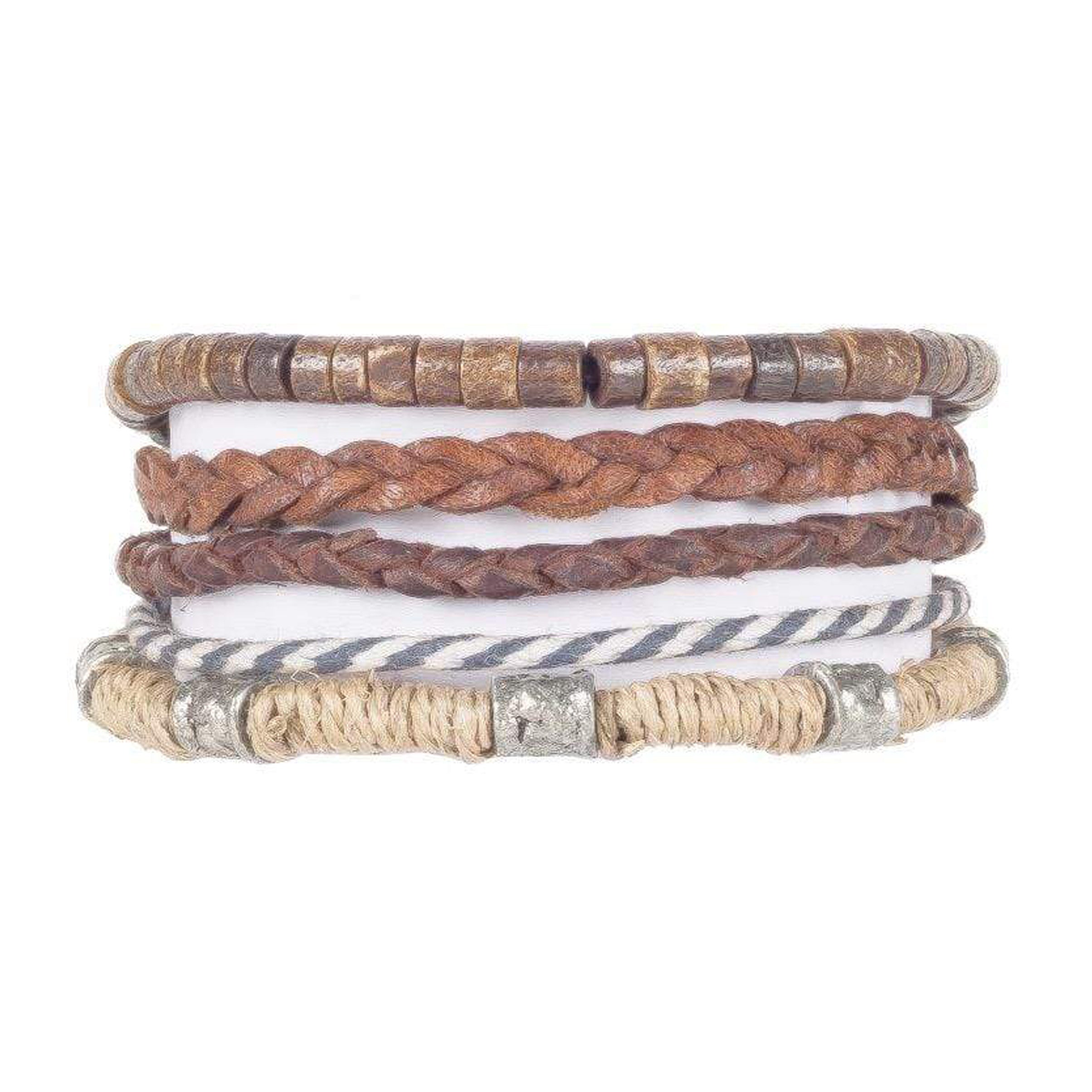 Want the holiday feeling! This all in one bracelet combines earthy tones with seaside Hamptons appeal. Including washed-out blue, white and tan you can just about smell the ocean when wearing this bracelet combination.