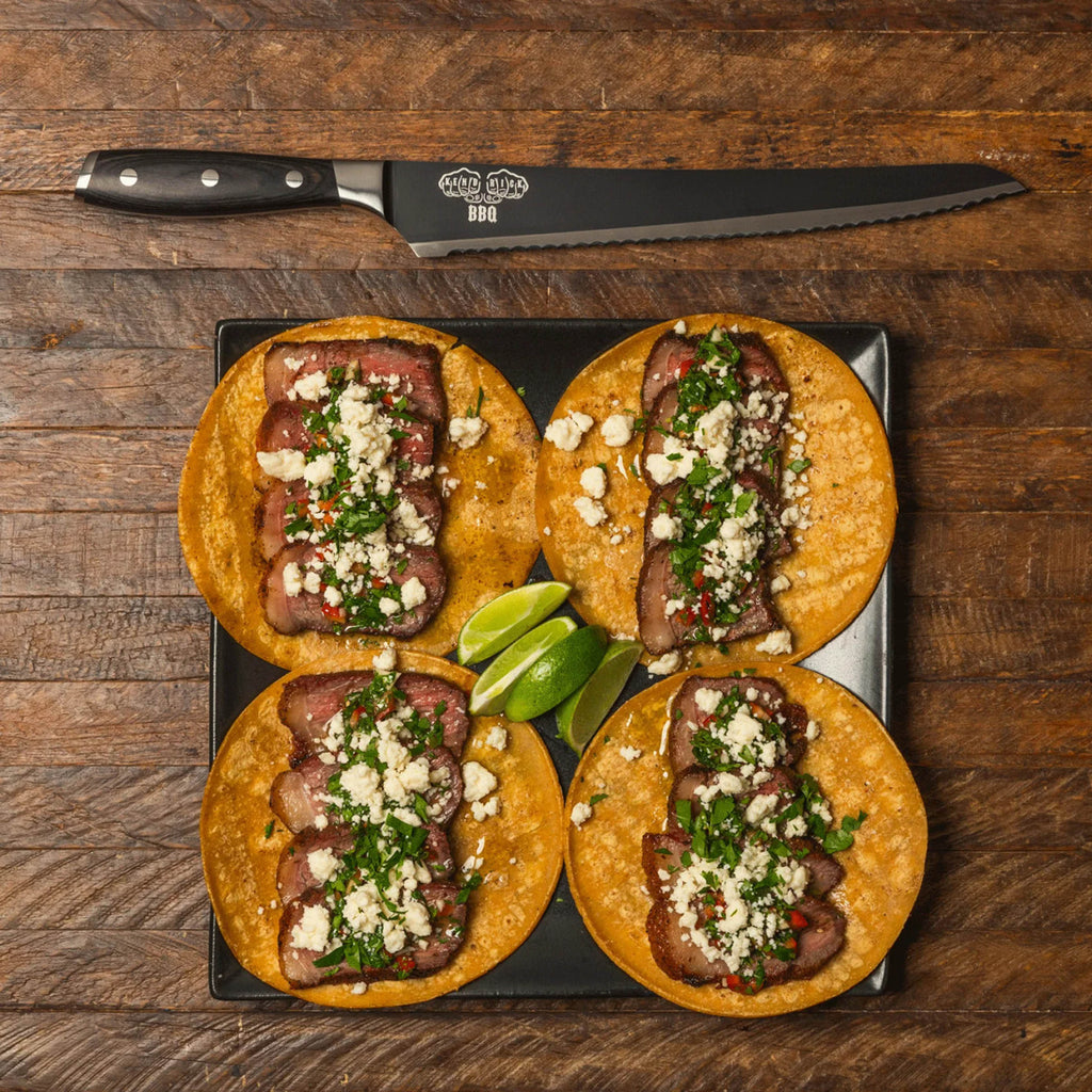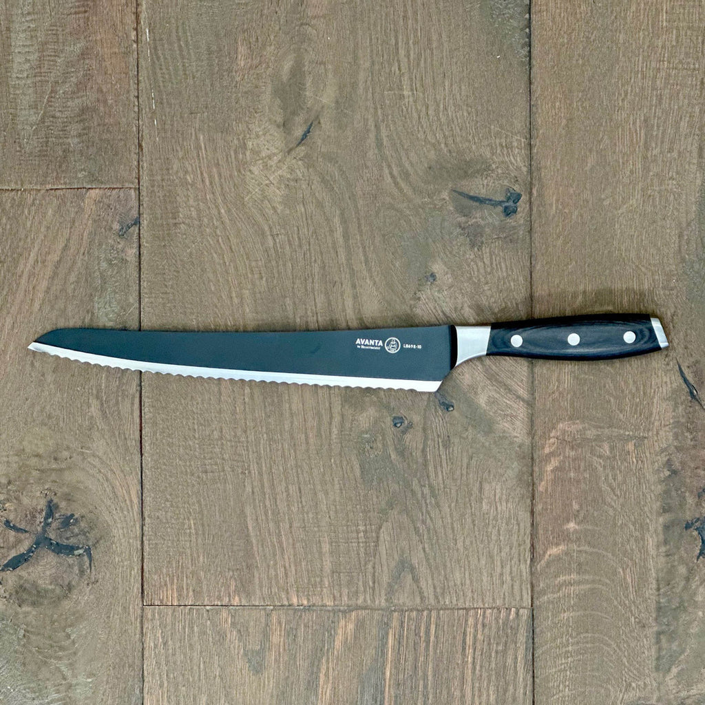 Cook like a boss with the Messermeister Avanta 10 Inch Brisket Knife, designed in collaboration with barbecue master Bennie Kendrick. Engineered for flawless pull-cuts, this scalloped slicer features a long, rigid German X50 stainless steel blade coated in durable black titanium for razor-sharp precision and superior rust resistance. Teeth along the edge grip your food without skating, while sharp valleys slice cleanly through brisket, bread, sandwiches, and soft-skinned fruits and vegetables. The offset triple-riveted ebony Pakkawood handle keeps your hand clear of the board for safe, smooth slicing. With solid bolsters and full-tang construction, this knife delivers balance and heft.