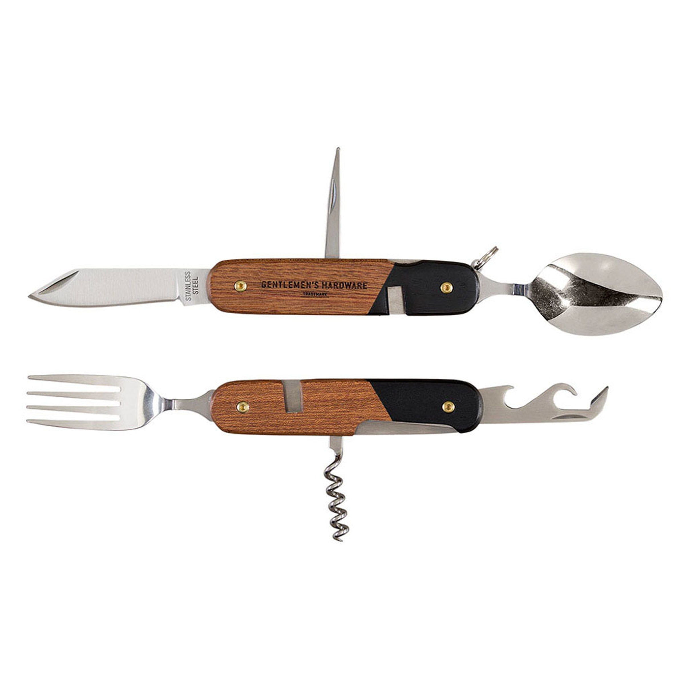 Gentlemans Hardware Camping Cutlery Tool will never let you be cut short while camping with this camping cutlery tool, also a good way of saving space in your camping bag. Contains Stainless steel Fork, Knife, Spoon, Corkscrew, Bottle and Can opener with an Acacia wood handle.