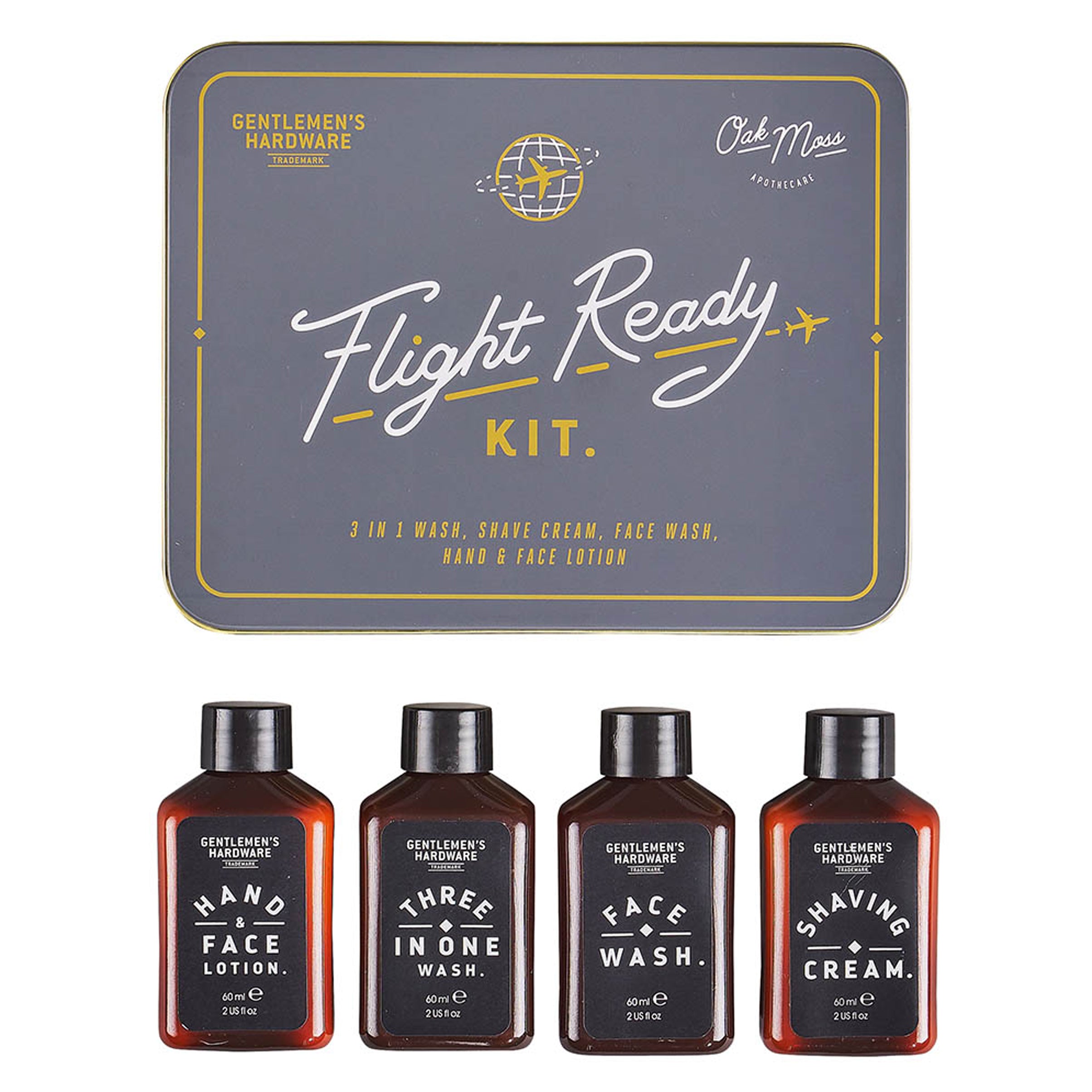 Gentlemans Hardware Flight Ready Kit, has you ready to fly at the drop of a hat, this kit is the perfect kit to keep packed away for weekend adventures. Kit contains 60ml of each - Shaving Cream, Face Wash, Hand and Face Lotion and 3-in-1 Wash. Each product scented with oak moss. Time to get flight ready!