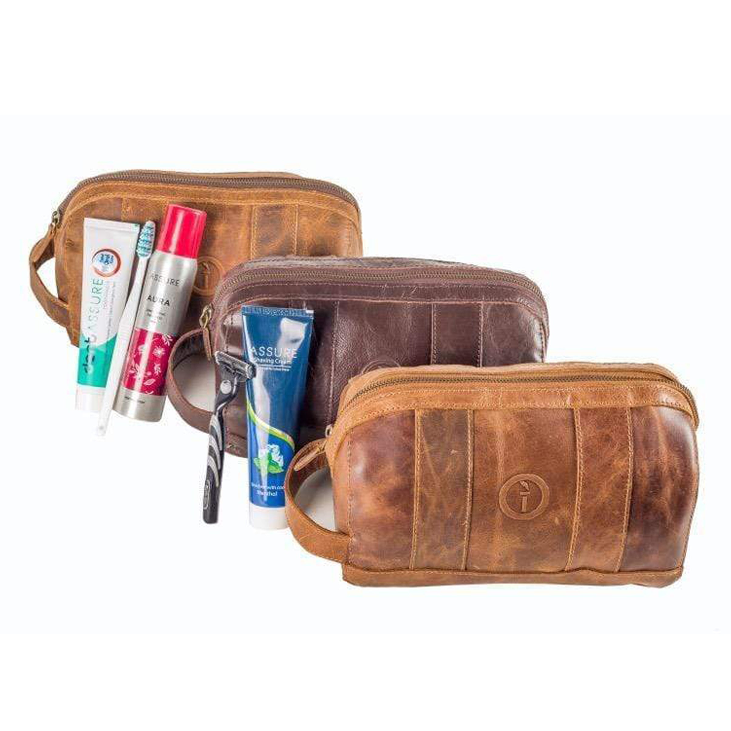 A toilet bag that's been designed to pack a punch, Crafted from genuine premium leather with a distressed finish. Sized at 25cm x 10 x 14cm your sure to fit all of your travel essentials in, featuring a handle on the side for easy carrying.