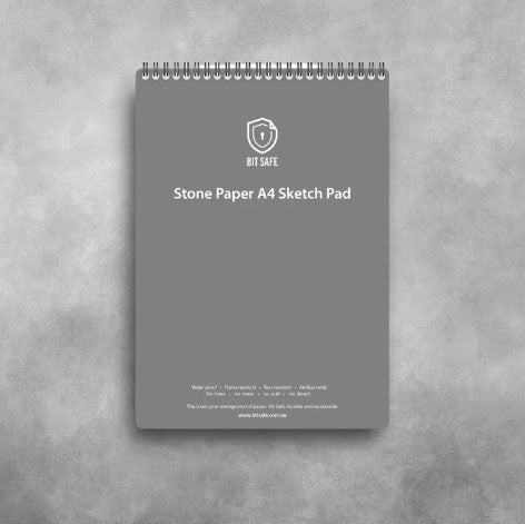Bit Safe A4 Sketch Pad is the one sketch pad that will outlast all others. Plan, design and create something without the worry of needing to be in a shaded area if it rains. These sketch pads are made from a special paper formulated entirely from stone. Yes you read that right! Stone! It's made using a mineral produced from limestone - Calcium Carbonate (CaC03) and combined with HDPE resin, making it a higher recyclable product than paper itself. Calcium Carbonate (CaCO3) is 16 million times more abundant than trees on earth.