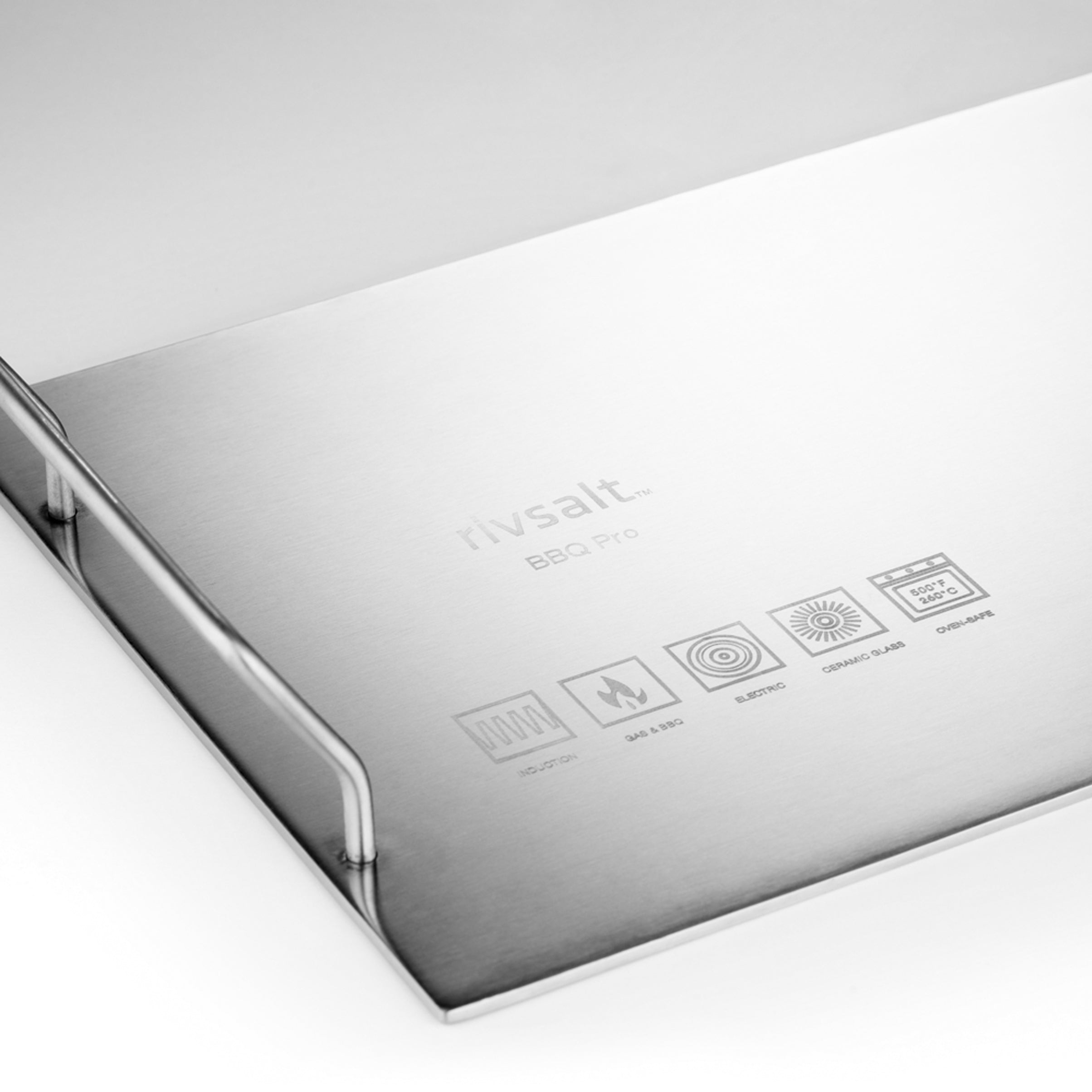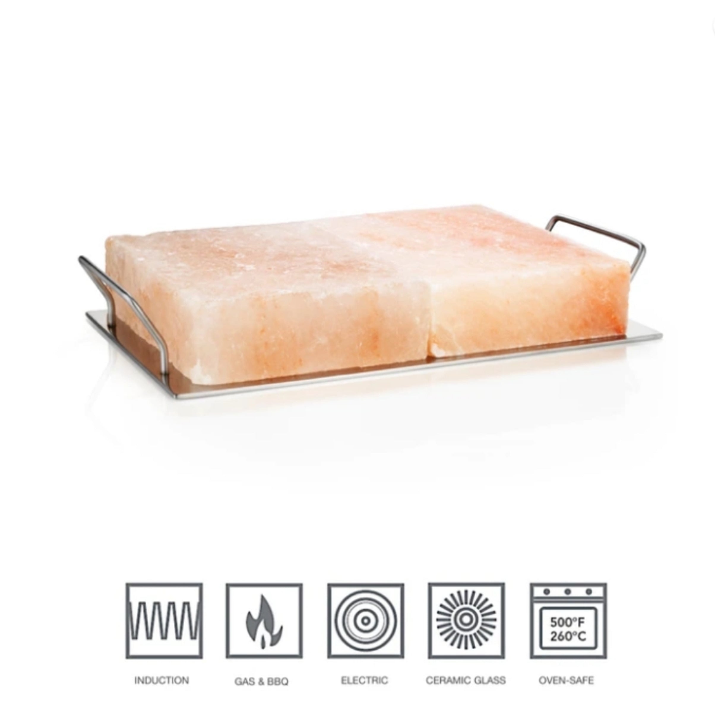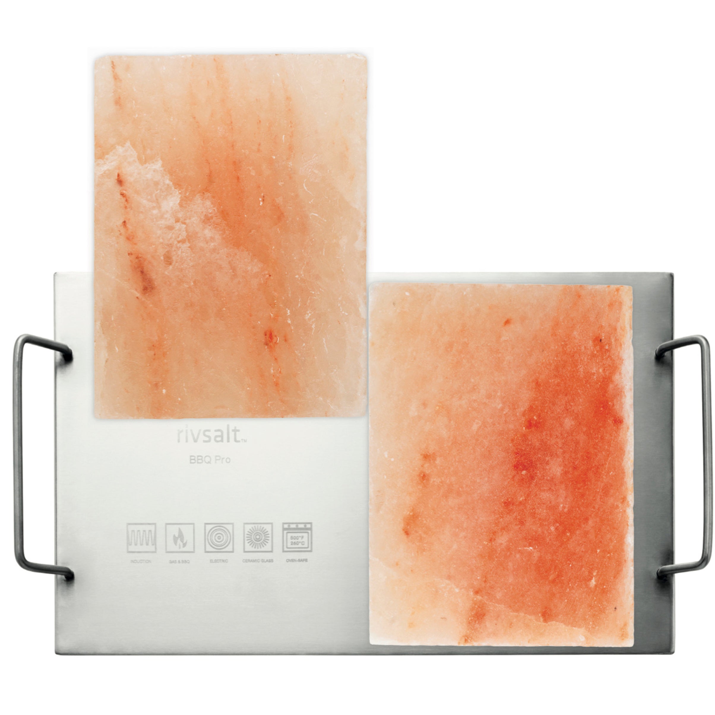 The BBQ pro comes with a metal tray to use on inductive stove tops and two large Himalayan salt blocks.