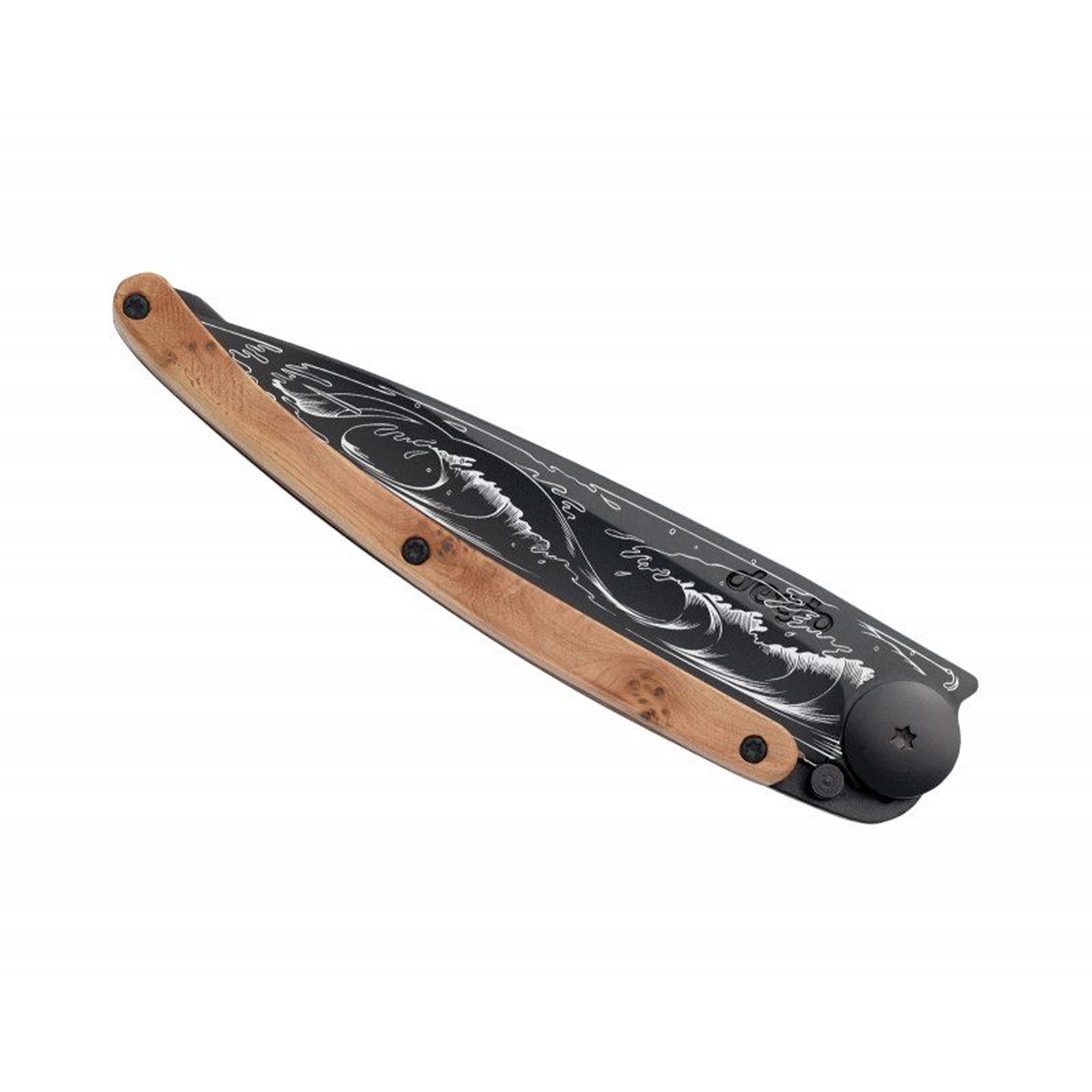 Engraved with the calming serenity of a wave following the flow of the Deejo knife.