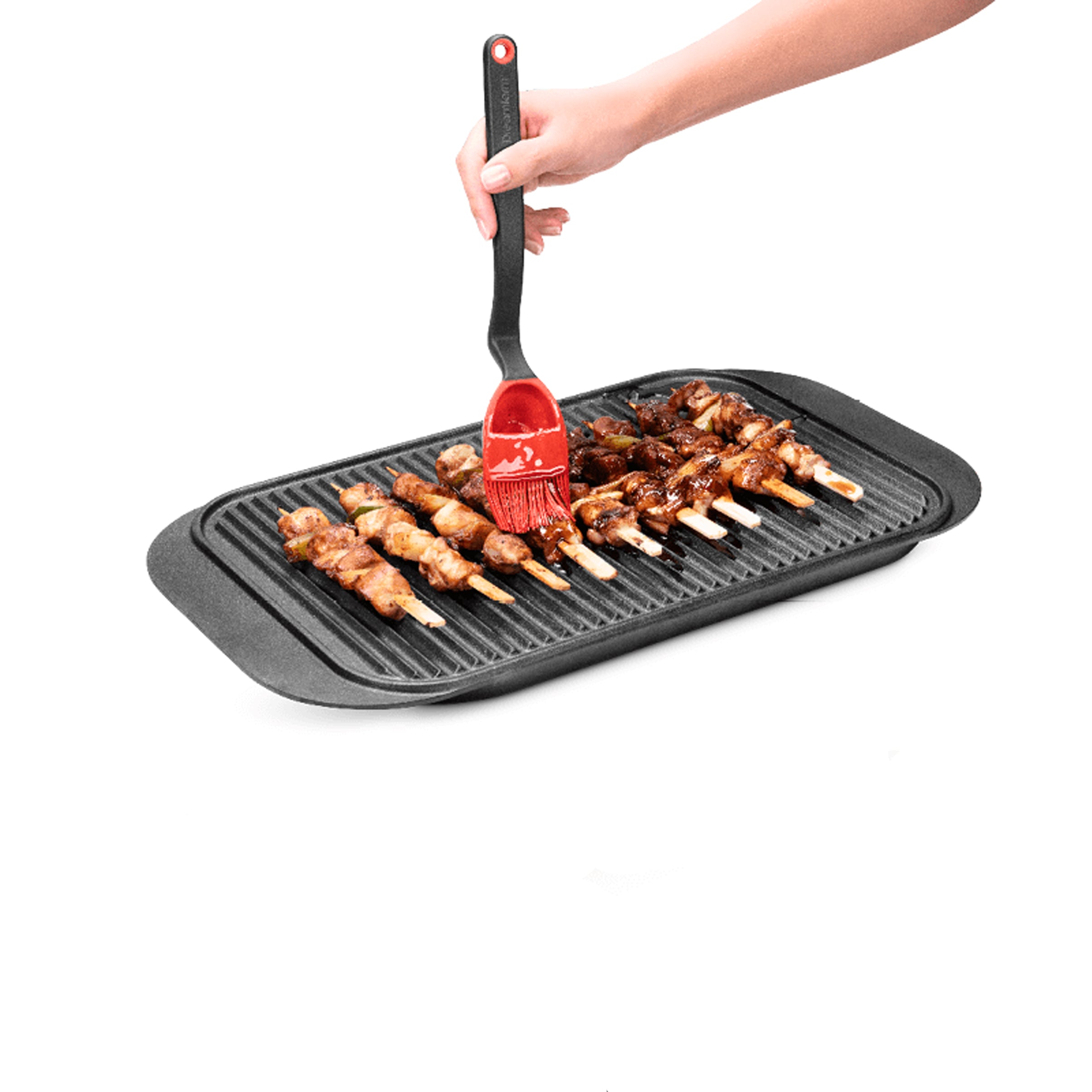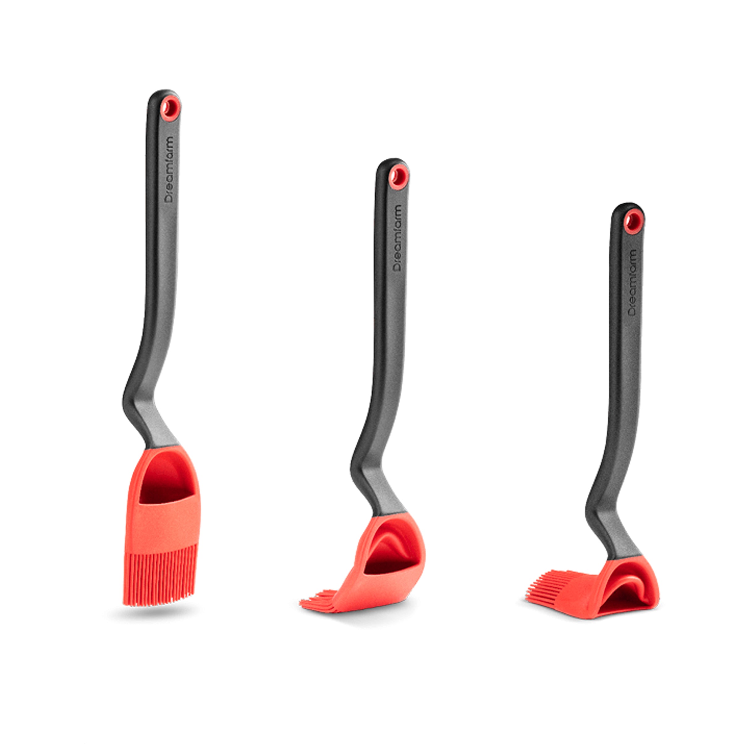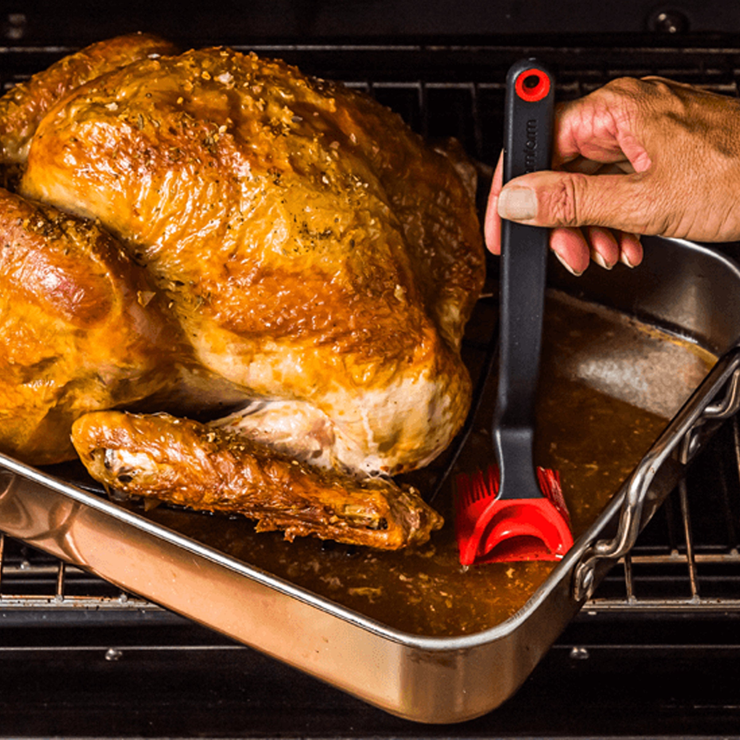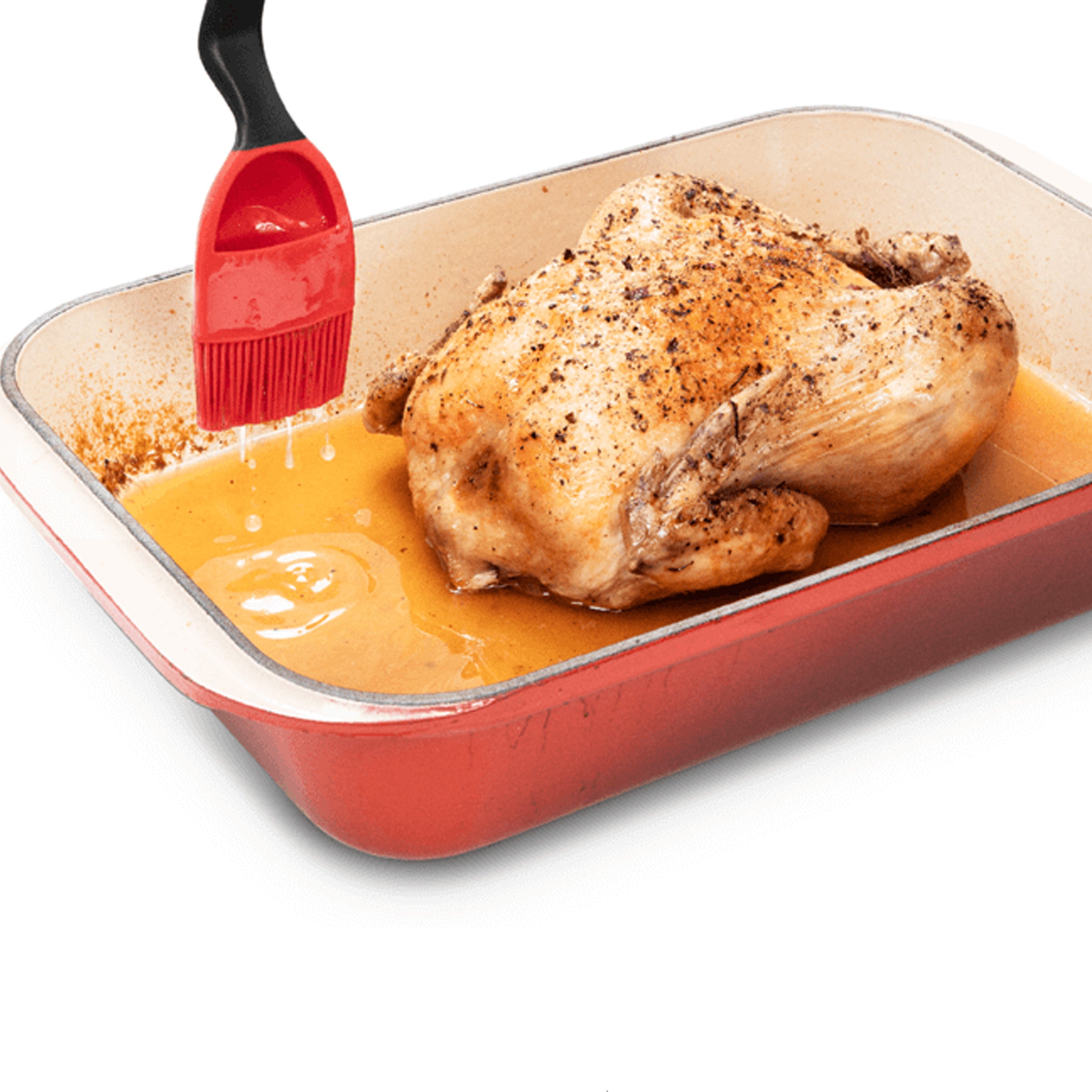 Dreamfarm Brizzle is a silicone basting brush that bends to scoop up 1 tbsp of liquid (ahem – that’s the equivalent of 15 bristle dips) from hard-to-reach places, drizzles to baste, and sits up off your bench with no drips. Brizzle’s cup shaped head, folds back to fit into small spaces and scoops up 1tbsp of your baste without tilting your heavy baking dish or tray. The 4 holes inside Brizzle’s head control the release of your baste, oil, or egg wash onto its bristles, for fast and efficient basting. Brizzle’s 100 soft, silicone bristles (yes, we counted them) are non-stick safe, dishwasher safe, and heat resistant to 260°C / 500°F.