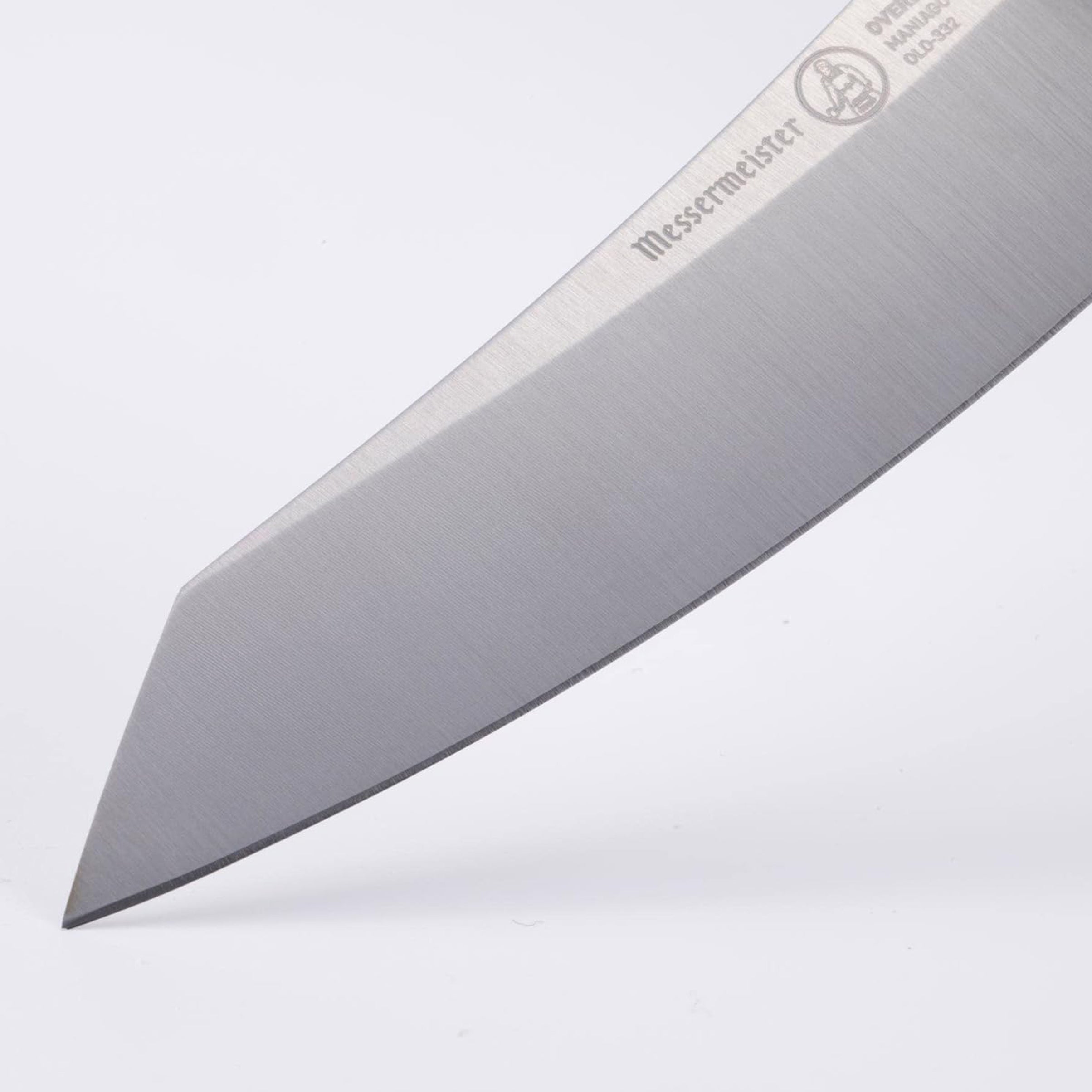 The compact 4.5” blade performs like a much bigger knife due to its swept edge geometry and cambered handle. The subtle offset in the blade leaves good hand clearance and the deep hollow-ground blade provides exceptional sharpness from the 62 Rockwell, nitro cobalt steel. The Chef's Knife has Messermeister's razor sharp, 16° edge.