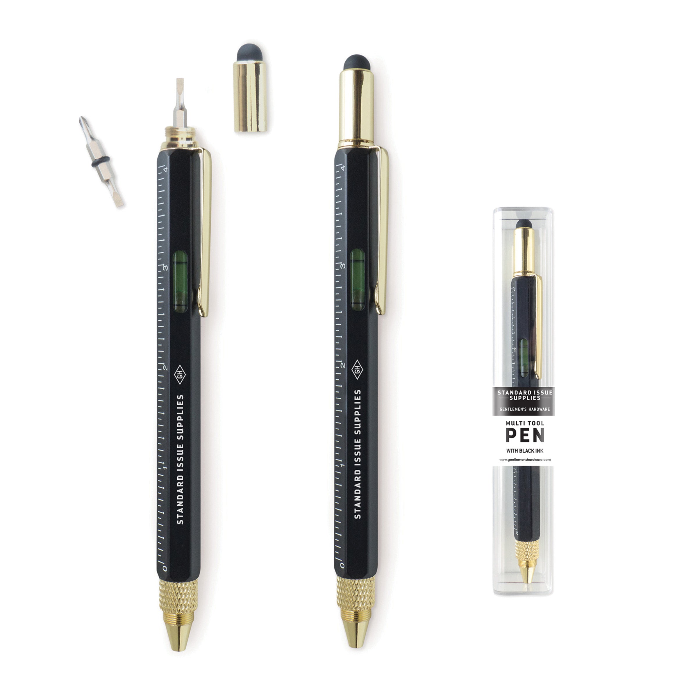 This black ink ball point pen contains 4 hand tools hidden inside it. Simply twist to write. The pen contains a mini level, 4 rulers, mini flat head screwdriver and stylus. Accepts standard ink refills. Packaged in a small perspex gift box.