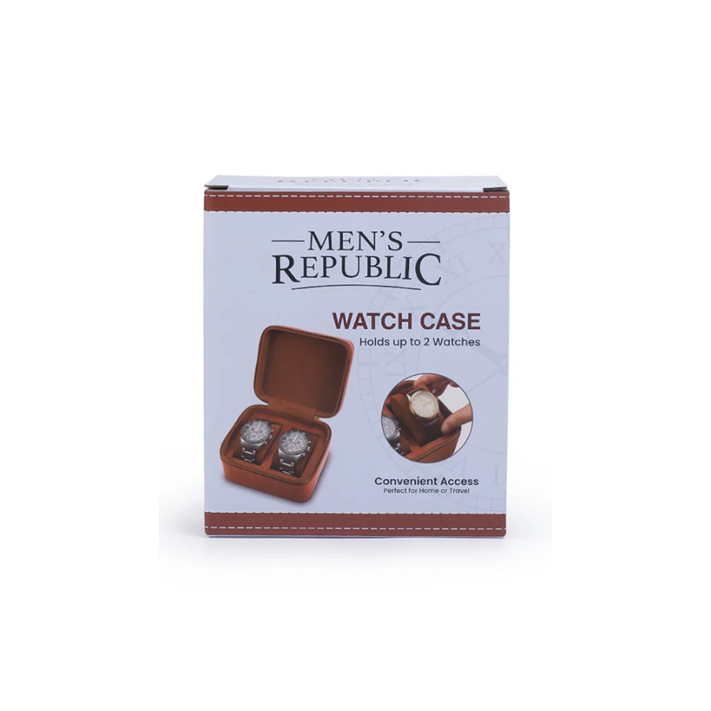 Keep your watches in perfect condition with the Men's Republic Watch Case. Designed to fit two watches, the case boasts a tan leather look and is perfect for keeping in storage or on display. A charming gift for the watch collector!